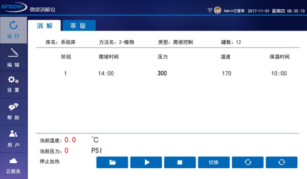 TANK PLUS使用ucos+安卓操作系統(tǒng) 運行穩(wěn)定可靠,采用7寸液晶彩色觸摸屏,觸控操作流暢簡便。頁面實時顯示工作狀態(tài)及溫壓變化曲線。內(nèi)置專家方法庫,可自行編輯及存儲用戶方法,也可以從云服務方法庫下載其他共享方法。內(nèi)置COT實時溫壓異常監(jiān)控系統(tǒng)能夠在任何一個反應罐出現(xiàn)溫壓異常時自動報警并切斷微波從而保護儀器安全。裝有內(nèi)部攝像頭可實時監(jiān)控爐腔內(nèi)消解罐運行情況。
